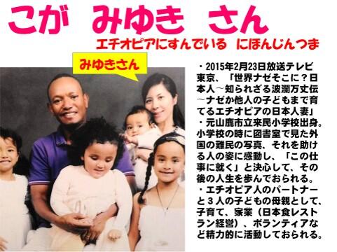 もう一人の方を紹介します。古賀美夕紀さんです。この方は、エチオピアに住んでいる日本人妻です。エチオピア人のパートナーとの間に、3人のお子さんがおられます。その他に、地域で知り合ったお子さんも、一緒に育てておられます。現在、日本食レストラン「さくら」を経営されています。