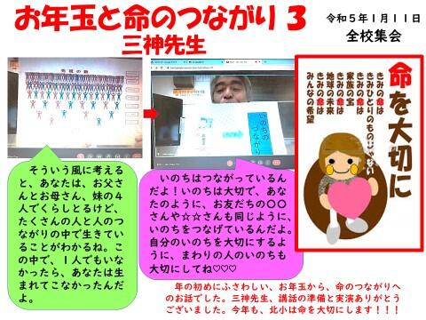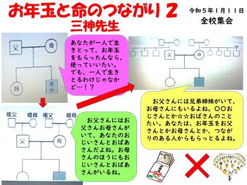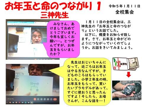 11日の全校集会は、三神先生のお話を全校で聴きました。「お年玉と命のつながり」という題でお話が始まりました。一体どんなつながりがあるのでしょうか!?