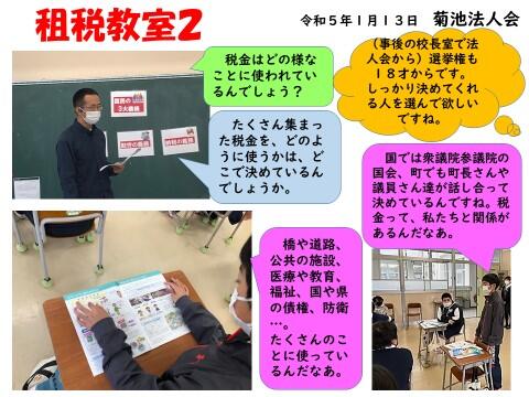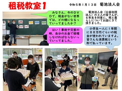 13日(金)は、菊池法人会の3人の方が来校され、6年生に税金と私たちの暮らしについて、DVDやパンフレットでわかりやすい話をしていただきました。一億円(偽札)の札束があり、みんな手にとって楽しく学んでいました。熊本県の令和3年度の歳出入は8,651億円。その内17%が県税1,468億円。と、いうことは、この重さの1500倍!