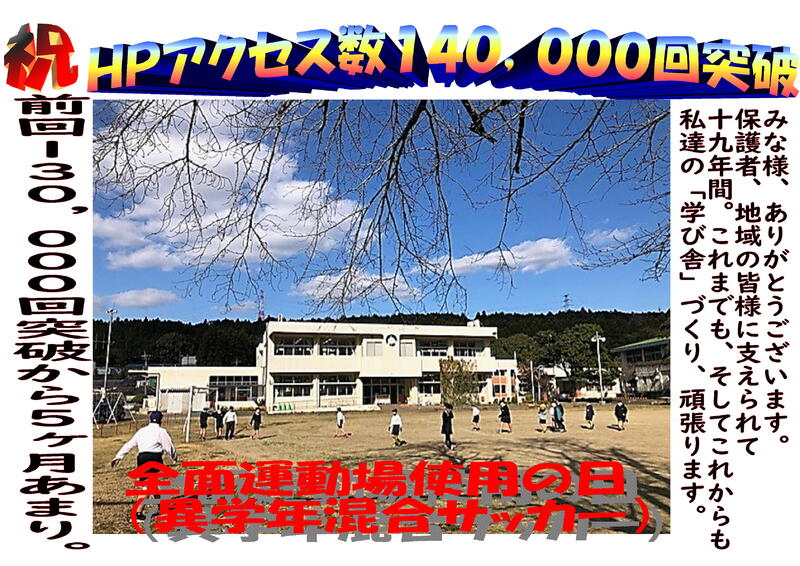 おかげさまで、学校HPへのアクセスが140,000回を突破しました。前回130,000回突破から5ヶ月あまり。皆様に支えられて大台突破です。いつもご閲覧ありがとうございます。