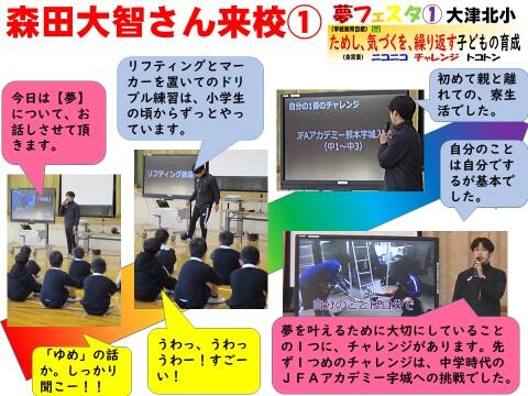 1月20日金曜日、昨年度の大津高校サッカー部キャプテン、現在早稲田大学1年生の、森田大智さんが来校され、実演や講話をして頂きました。まずは、速報です。詳細は追ってお知らせします。