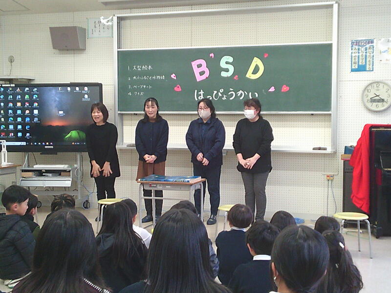 本校に月に2度、読み聞かせに来てくださっているBSD(ook mile ream)の皆さんです。本日は、ロングバージョンの読み聞かせとして、全校国語の授業で読み聞かせをしていただけることになりました。