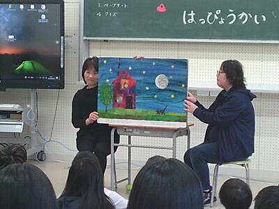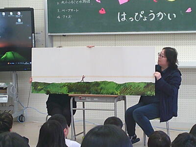 大きな絵本ならではの縦や横が更に拡大された絵本でお話が繰り広げられます。月の満ち欠けの仕組みを授業で学習した子どもたちは、え?ありえん!!と思うこともあったと思いますが、ニコニコと微笑ましく聞いています。
