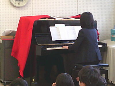 ピアノ伴奏は寺本教諭です。藤本さんは、自己紹介の中で「今、一生懸命やっていること、今はやめても一度やってみたことは、一生の宝になる。いつでもまたやろうと思えばスッととりかかり、生きがいとなり得る」ということも子どもたちに伝えてくださいました。たくさんの子どもたちに響いたことではないでしょうか。