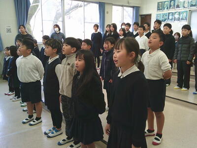 次に北小水物語の合唱です。4年生で学習する水の学習の内容の歌で、真城・矢護川・平川の栄えていった歴史や苦労や努力や地域の自然豊かな情景とが歌に組み込まれていることを説明しながら子どもたち全員で合唱しました。