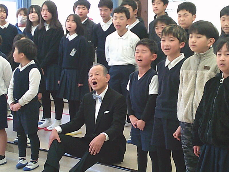 本日は大きな行事2本立てです!!藤本憲生(ふじもと のりお)様に来校いただきまして、テノール歌手としての歌声を児童に披露していただきました。