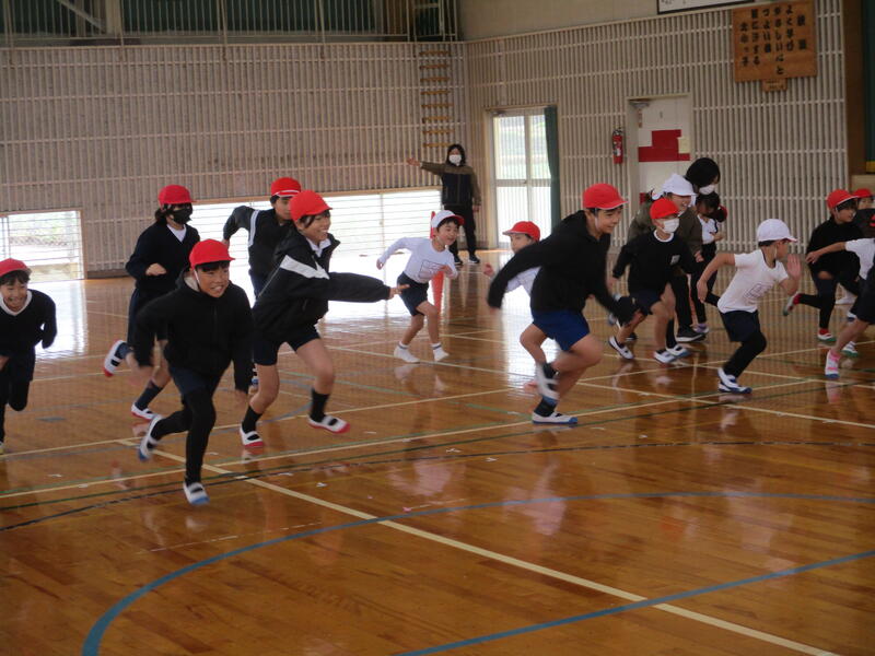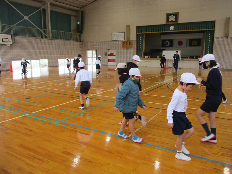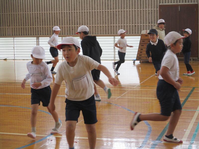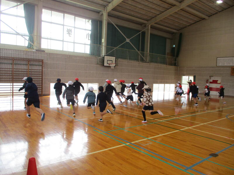 体育館では、「ねことねずみ」ゲーム、ライン鬼ごっこをしました。