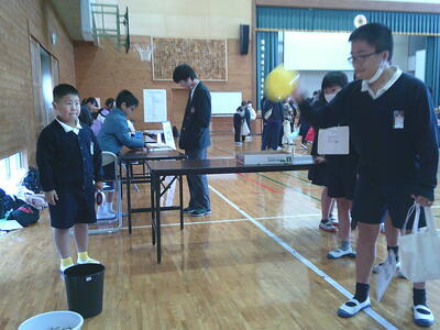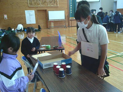 本校からは「KISUKE」ゲーム。五つの紙コップの中に潜んでいる「炎」のマークを勘で当てる「ファイヤーはどこ?」「あみだくじ」「ワンバウンドボール入れ」のゲームを提供しました。
