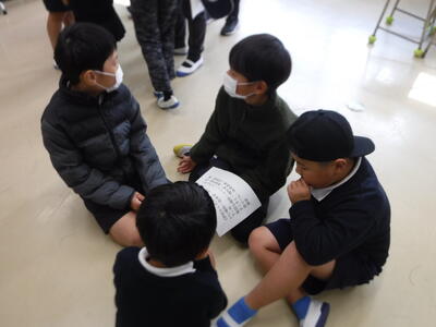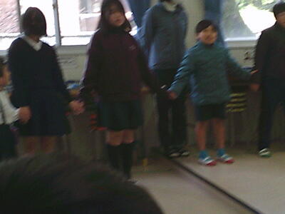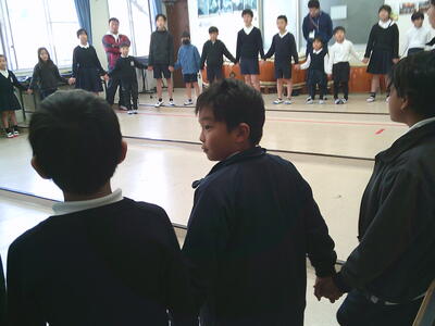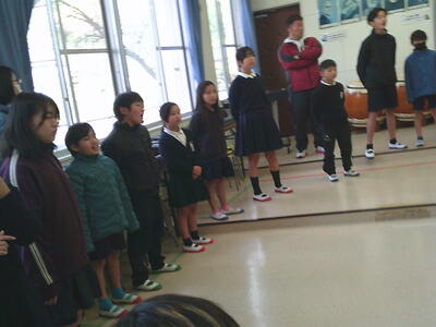 次に「おもちゃのちゃちゃちゃ」で「ちゃ」の時に手拍子を入れる頭脳を使った斉唱をします。縦割り班で練習をしたあと、一斉にみんなでやってみます。まあまあ難しい・・・。でも練習の成果があって一斉でするときはほぼ上手くできていました。上級生や得意な人のリーダーシップがものをいいます。