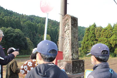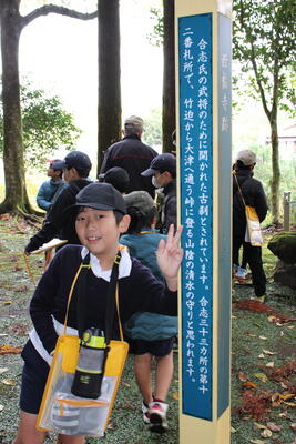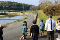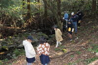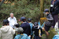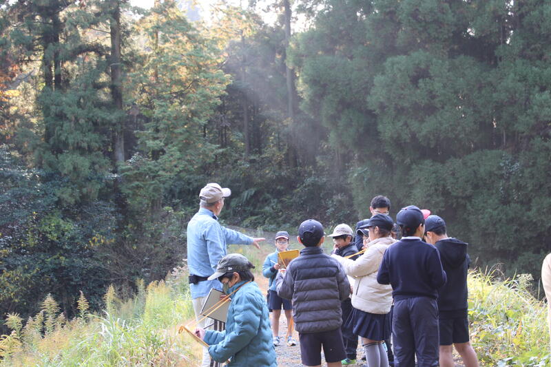 稲刈りをした後の田に水を張り、地下水を涵養していることや矢護川の水源である諏訪神社など詳しく説明してくださり、メモをがんばる4年生。山道をたくさん歩き、疲れてきたのか、何人かは水を触ったり、景色を見たり、蛙に大騒ぎ!(見つけたのは稲尾教諭でしたが・・・)