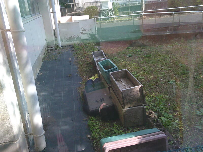 図書室から運動場を見ていたら、東側の中庭っぽいところのプランターの陰に4年生のけいたさんが隠れていました!(窓越しに写真を撮ったので、私の名札が反射して「玲子」と写っていますが・・・)