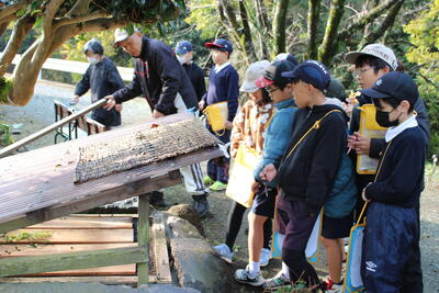 本日は、4年生のフィールドワークで矢護川の水源や真木地区の水源地に水の学習をしに行きました。