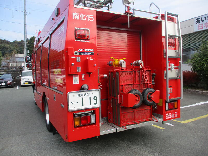 消防車(化学車)の見学を行いました。油や薬品などが燃え広がった時に必須の車だということです。空港が近く、工場が多いため配備されているようです。車のナンバーが「119」でした。