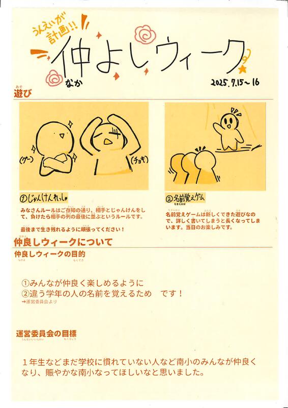 たくさんの先生方に囲まれながらも、南小みんなが仲良く楽しむ仲良しウィークに向け、