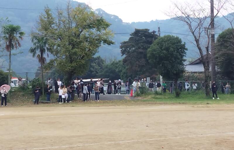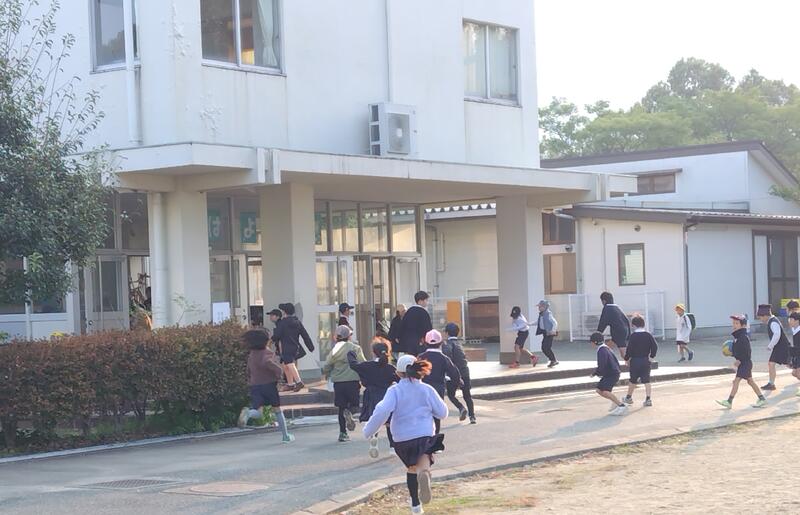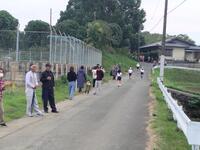 出発まで室内で待機(たいき)することになっていた子どもたちも外に出て、全校児童で持久走を応援することになりました。