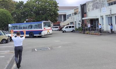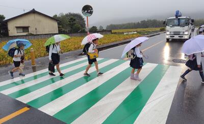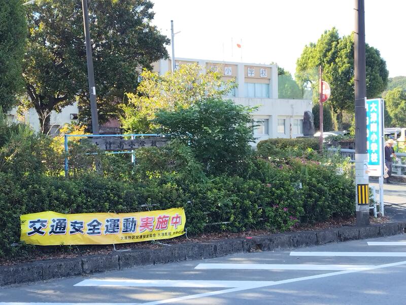校舎前の県道202号線に、「交通安全運動」の横断幕が掲げられていました。