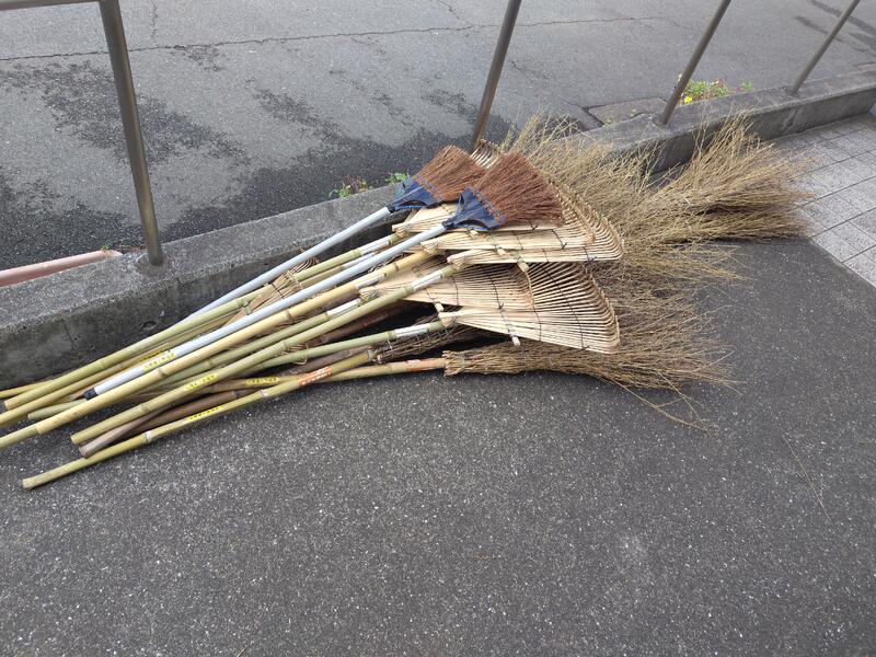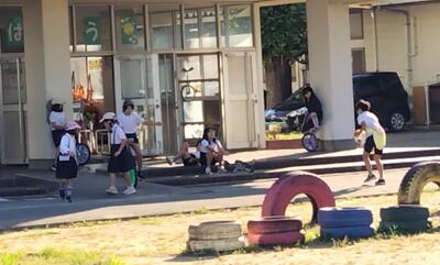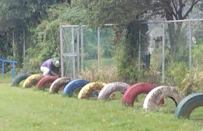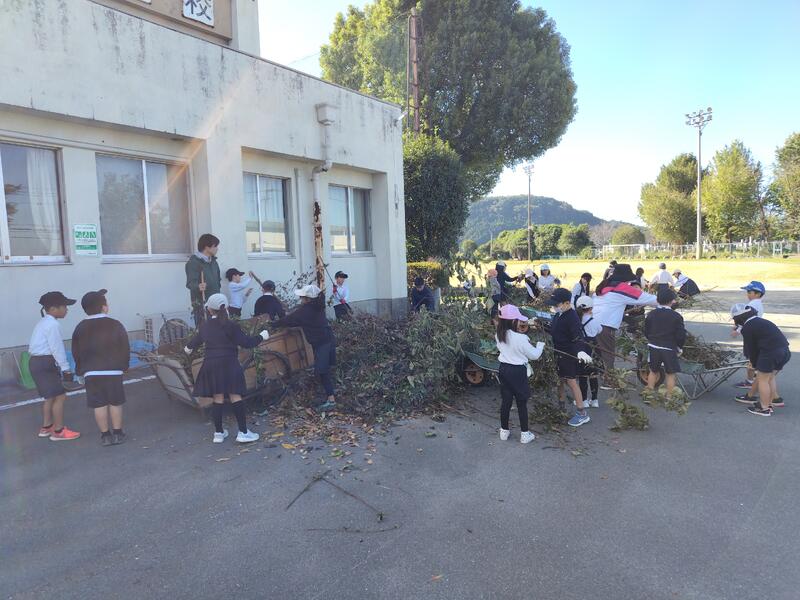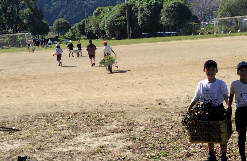 校務員さんも、運動場のタイヤの草や運動場の芝刈りの跡の枯れ草集めなど、