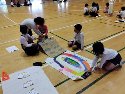 陣内幼稚園の園児を相手に、自分たちで作成した動くおもちゃを披露していました。