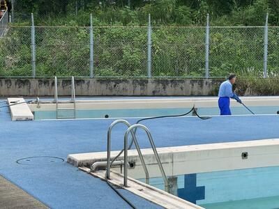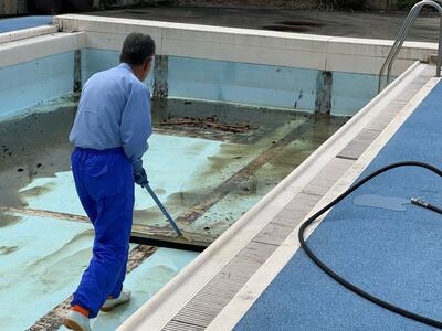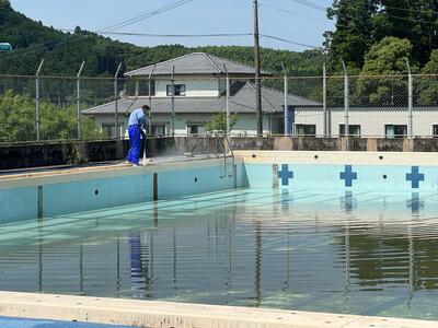 体育主任の先生が、来週から始まるプール掃除に向けて下準備をされていました。