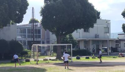 それを見ていた担任の先生がアドバイスされると、ボールは放物線(ほうぶつせん)を描いて飛んでいきました。