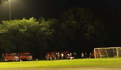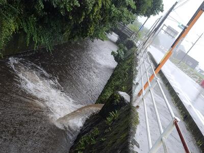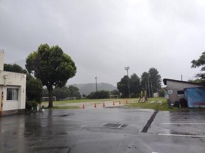 運動場には水がたまっていますが、排水の道から少しずつ雨水が流れ出しています。
