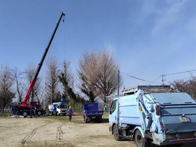 4本同時に立て、やぐらの基礎の上に移動させたあと、