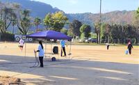 子供たちが教室にもどると、陣内幼稚園の先生と職場体験の高校生が、幼稚園の運動会の準備を始められました。