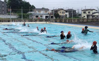 運動場を通り抜け草原を突き抜けて、やっとプールにたどり着きます・・・