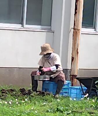 職員室に草刈りからもどっていると、校務員さんが黙々と花だんを開墾されていました。