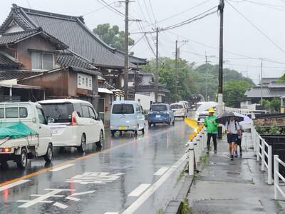 県道202号線は、雨の日はさらに交通量が増し、場所によっては、車がはねる水しぶきが歩道まで飛び散ります。