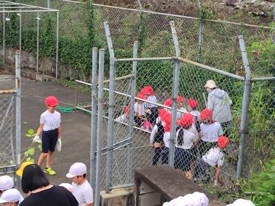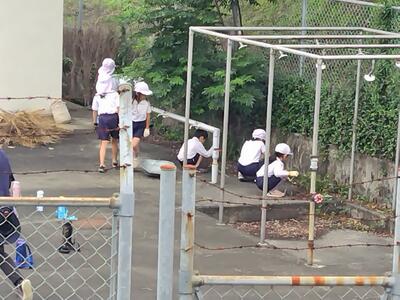 昨日、1・2年生、3・4年生、5・6年生が、がんばって掃除したプールを見に行きました。