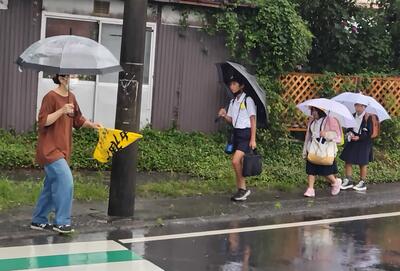 土砂降りの中、笑顔のステキな女性に、今日も子供たちがエスコートされていました。