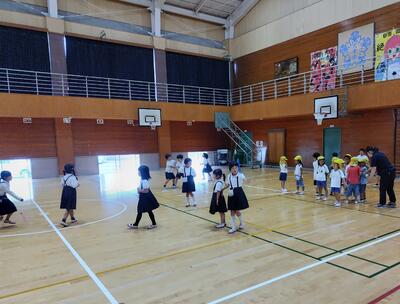 1年生と陣内幼稚園のきく組さんの交流会が始まっていました。