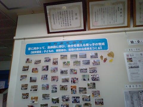 大津南小学校の職員室前には、写真がいっぱい飾られています。