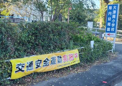 学校に到着すると、黄色い交通安全運動実施中の横断幕が