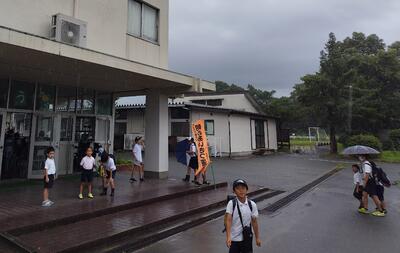 雨が降り出しそうな天気に様子見の子供たちも加わってあいさつの輪が広がっています。