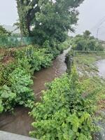 運動場の木々も揺れ、井手の水も濁り濁流が流れています。