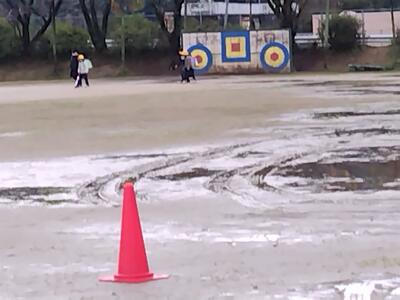 しかし、昨日の夜、今朝の雨ですっかり運動場は、