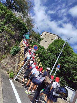 城山小学校の階段を登って、被爆者の体験講話を聴きました。