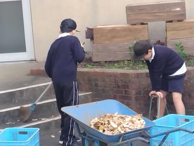 出勤すると、地域の方が落ち葉を一生懸命集めていただいていました。