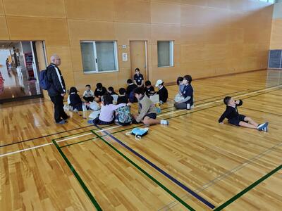 バス待ちの南小の子どもたちに体育館のモップがけをお願いすると、
