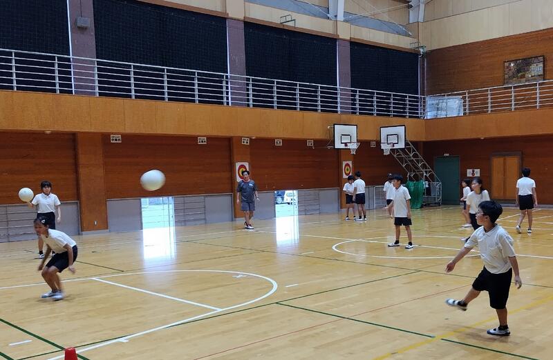 この2個のボールを使ったドッジボールは南小独自ルールで、伝統的に行われているそうです。