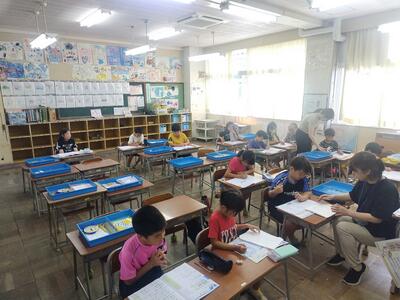3年生「迷路づくり」、2年生「漢字テスト」が同時並行で行われています。