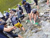 川の一部に放流されているニジマスを素手、あみ、ざるで捕獲し、さばき、竹串を刺して焼いて食べる活動です!