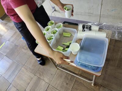 昨日収獲したきゅうりを、先生がお家でカットされ、班ごとに分けられています。