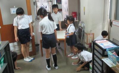 掃除の時間になると、1年生と5年生が校長室前にやって来ます。