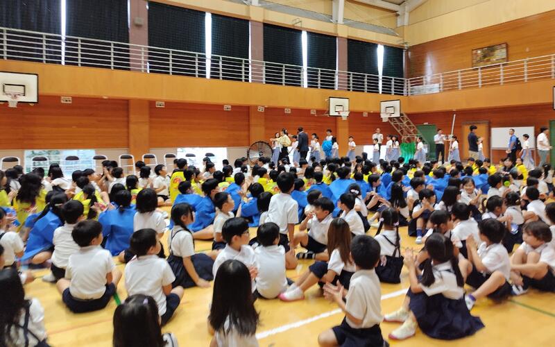 6年生の南小の日常を伝えるコミカルな動きと説明に、勝利國小の子どもたち、そして先生方にも笑みがこぼれていました。