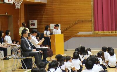 教育長、教育部長、新聞社、報道機関、そして南小の子どもたちの歓迎の大きな拍手の中、入場しました。