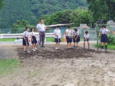 朝、対応に困っいた坂道の泥がをどうしようかと思案していたところ、5・6年生が通りがかりました。