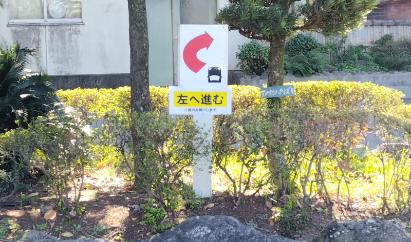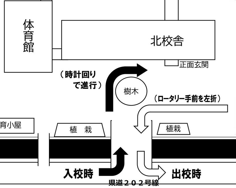 〇出校する時は、樹木(泰山木)の左側を通過し、県道202号線に出る